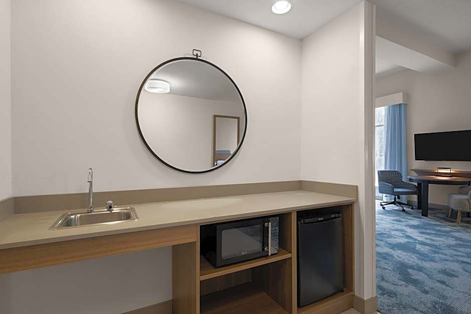 This room features a flat-screen TV and a bathroom with a walk-in shower. It includes a microwave, fridge and coffee maker.